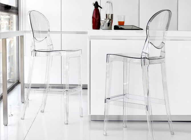 Sgabello con struttura in policarbonato. Impilabile. Per uso interno/esterno.